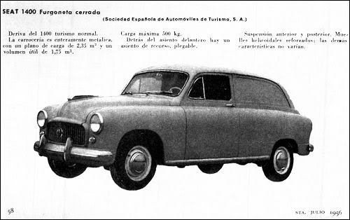 Siguiendo con las variantes comerciales del 1400, tenemos además está fotografía de época de un Seat 1400A berlina transformado a furgoneta de forma artesanal por algún particular para adaptarlo a sus necesidades. No es un modelo fabricado por ningún carrocero conocido, pero la forma de la carrocería se aproxima bastante a la siguiente producida en masa, que es la que veremos a continuación. Fue seguramente único en su día, y lo más probable es que ya no exista. Además carecemos de identificación como matrícula o bastidor para poder intentar localizarlo.